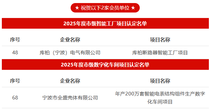 根据《关于开展2025年度宁波市智能工厂、数字化车间评定工作的通知》(甬经信笺〔2026〕23号)等文件要求,经企业申报、专家评审、各地推荐等程序,我协会2家企业分别列入2025年度市级智能工厂、数字化车间项目认定名单,向以下企业表示祝贺!(排名不分先后)