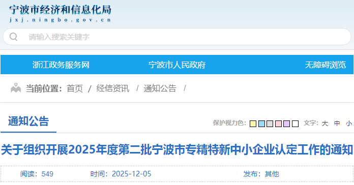 - 2025-12-12关于组织开展2025年度第二批宁波市专精特新中小企业认定工作的通知