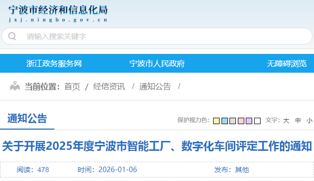 为贯彻落实《宁波市加快推进新型工业化行动纲要》和《宁波市智能工厂梯度培育实施细则》要求,推动企业迭代实施数字化车间、智能工厂项目,实现更高数字化水平,现组织开展2025年度宁波市智能工厂、数字化车间评定工作。有关事项通知如下: