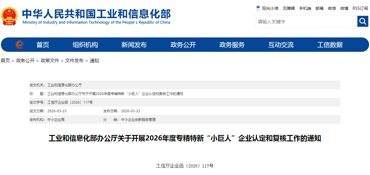 - 2026-03-30转发工业和信息化部办公厅关于开展2025年专精特新“小巨人”企业认定和复核工作的通知