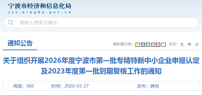 根据《优质中小企业梯度培育管理办法》(工信部企业〔2026〕2号)和《关于印发〈宁波市优质中小企业梯度培育管理实施细则(暂行)〉的通知》(甬经信中小〔2022〕124号),现组织开展2026年度宁波市第一批专精特新中小企业申报认定及2023年度第一批认定到期企业复核工作。有关事项通知如下: