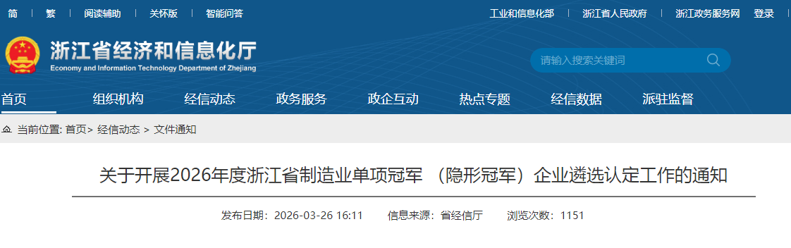 - 2026-04-03转发关于开展2026年度浙江省制造业单项冠军 (隐形冠军)企业遴选认定工作的通知